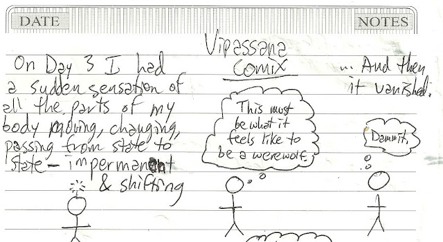 I learned a lot, but I found it very difficult and stressful, especially towards the end of the course when I began experiencing some anxiety. The main thing I learned after ten days was that experiential insight meditation is not bunk; there is something very powerful and potentially useful there, but it requires more dedication and mental stability than I can spare at this point in my life. After it was over, I went to a computer and typed up notes nonstop for about six hours. I also sketched some Vipassana Comix, which I think give a general impression of my experience.